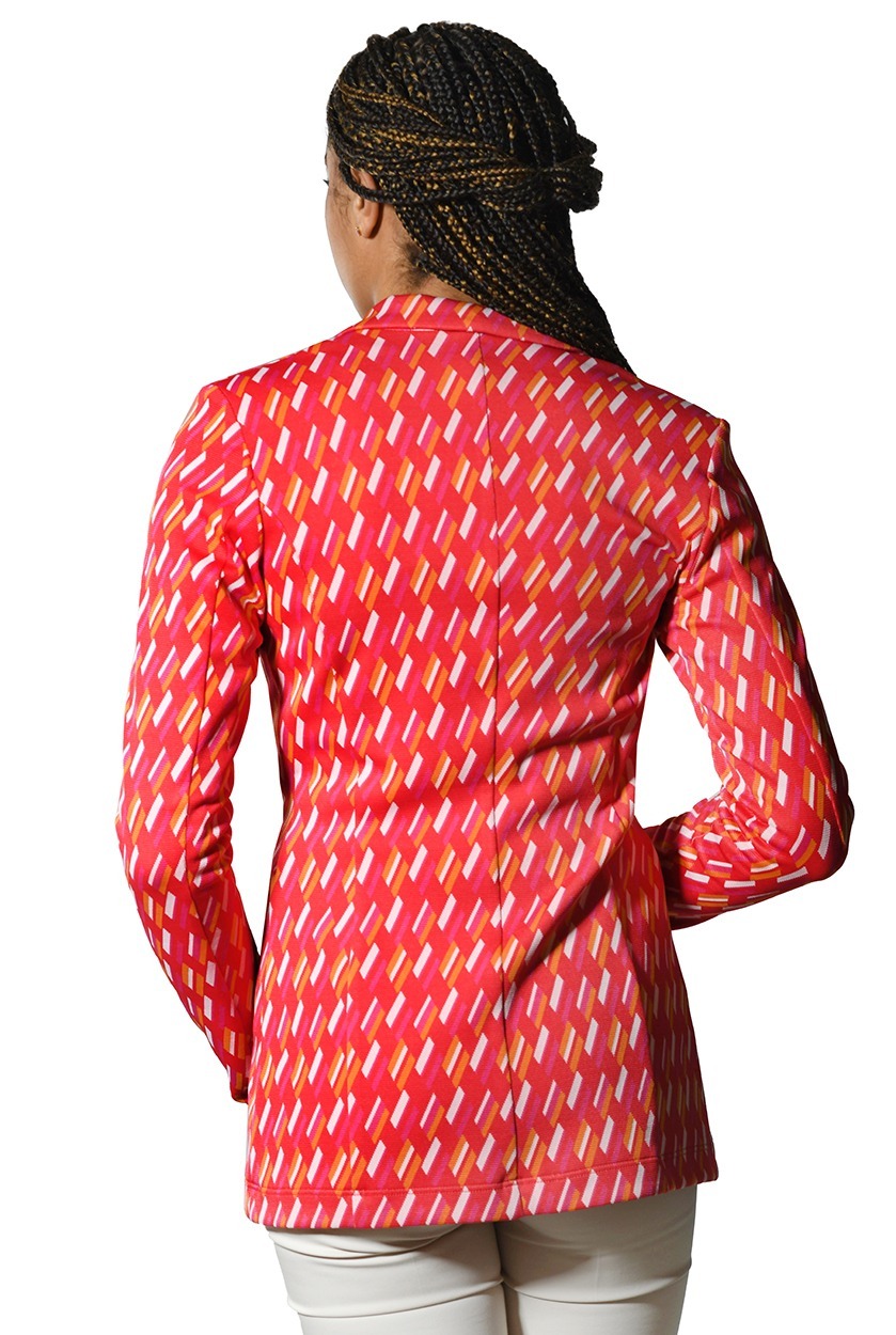 Bunter Jerseyblazer. Unser Model Mathilda ist 1,87m groß und trägt die Gr. 36.