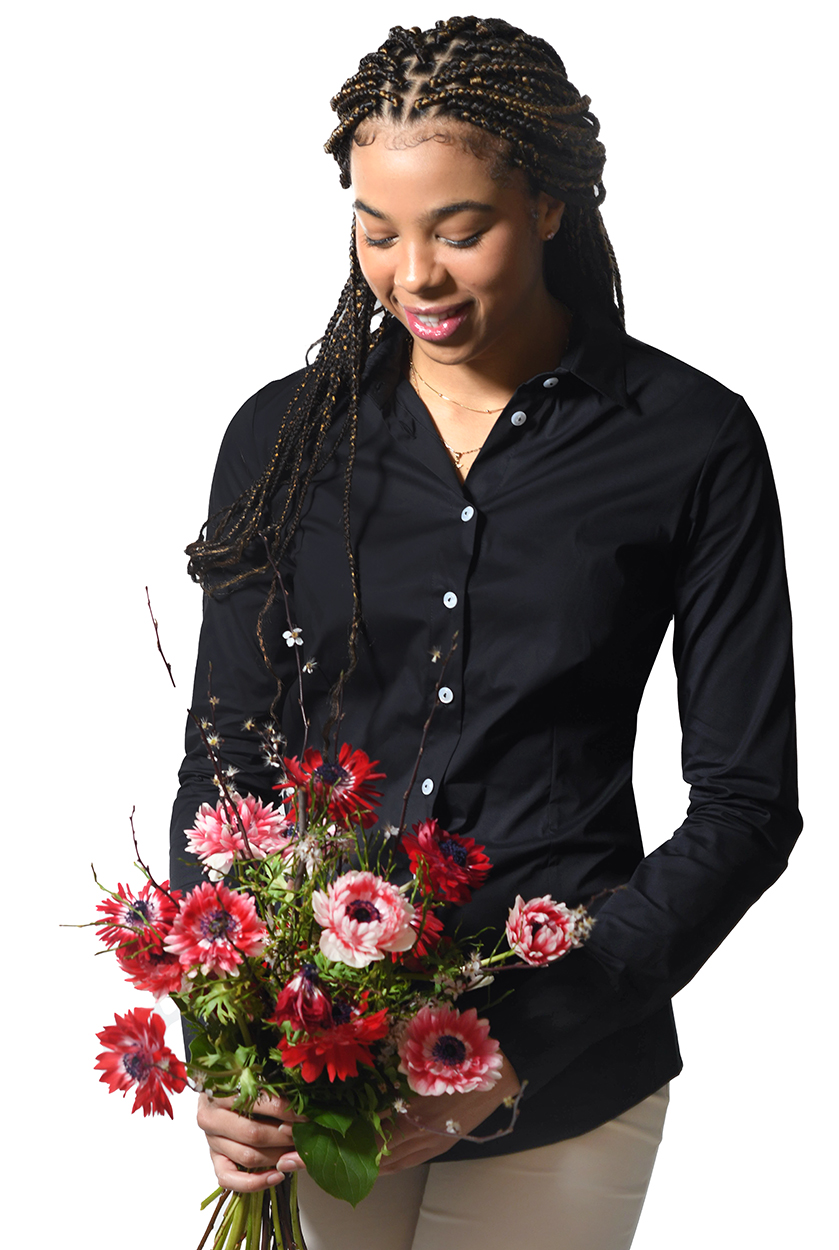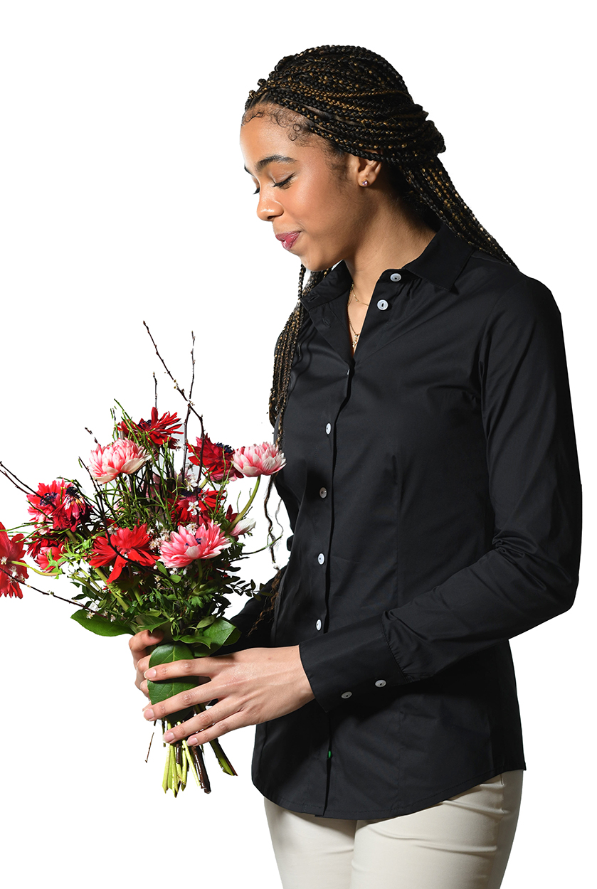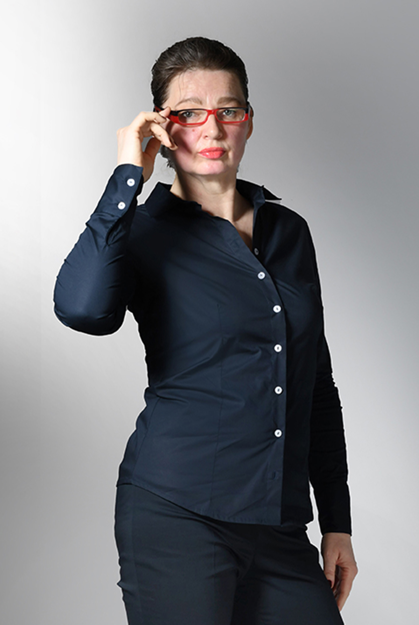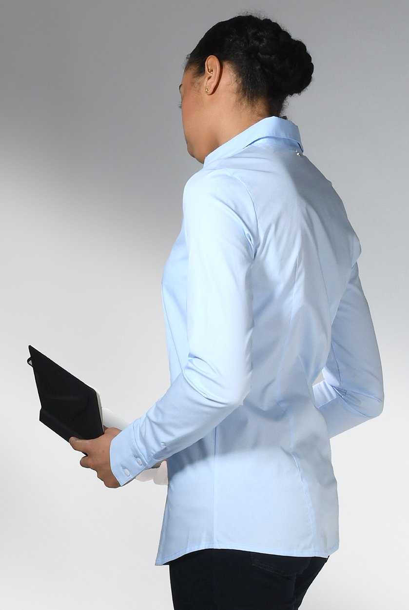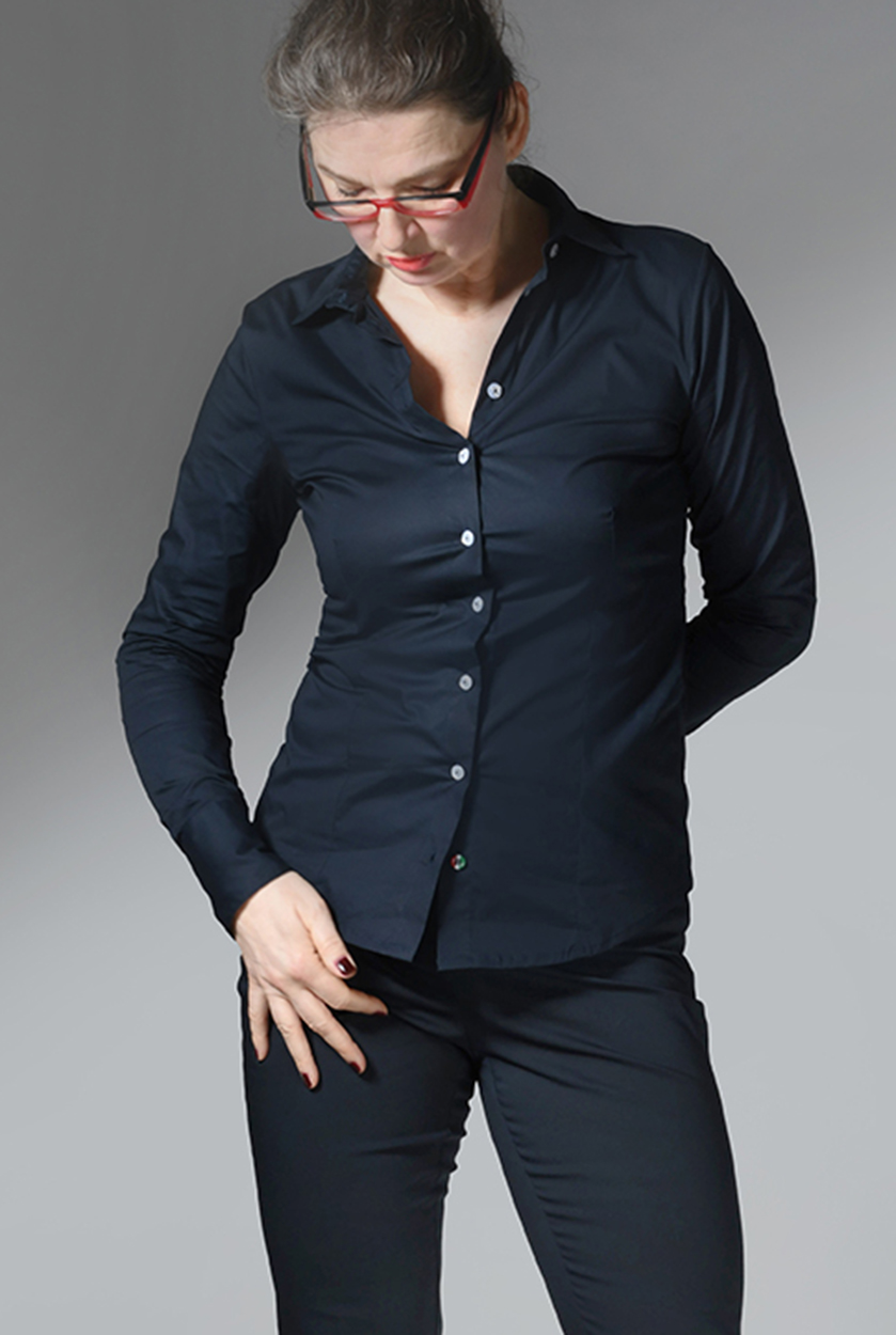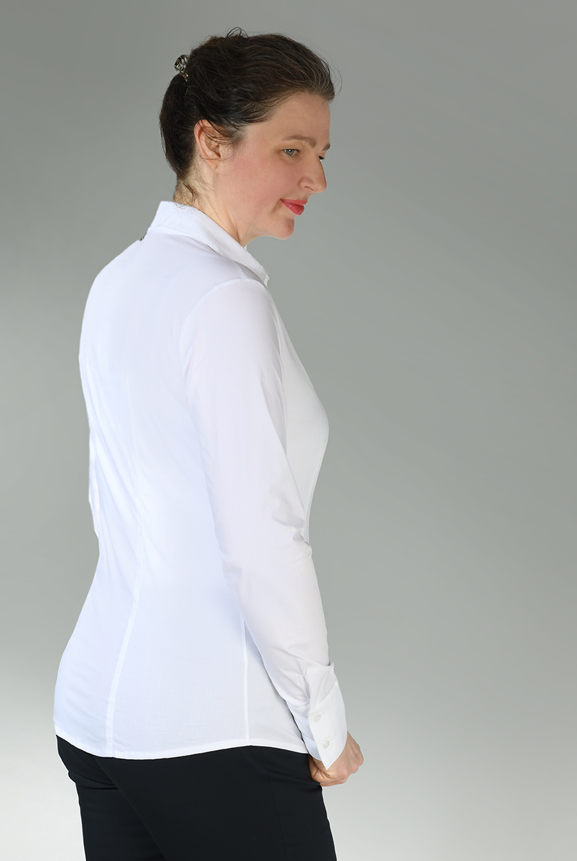 Langarm Basic-Bluse aus Stretchbaumwolle in 4 Farben. Unser Model Sylvia ist 1,90 m groß und trägt die Gr. 42. Unser Model Mathilda ist 1,87m groß und trägt die Größe 36. Die Bluse fällt kleiner aus. Bitte eine Größe größer bestellen.