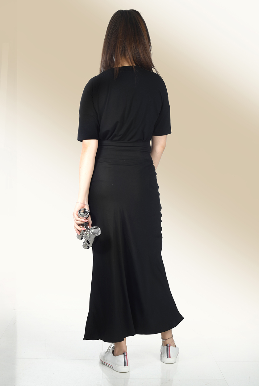 Midirock in Seidenoptik. Unser Model Atena ist 1,80m groß und trägt die Gr. M.